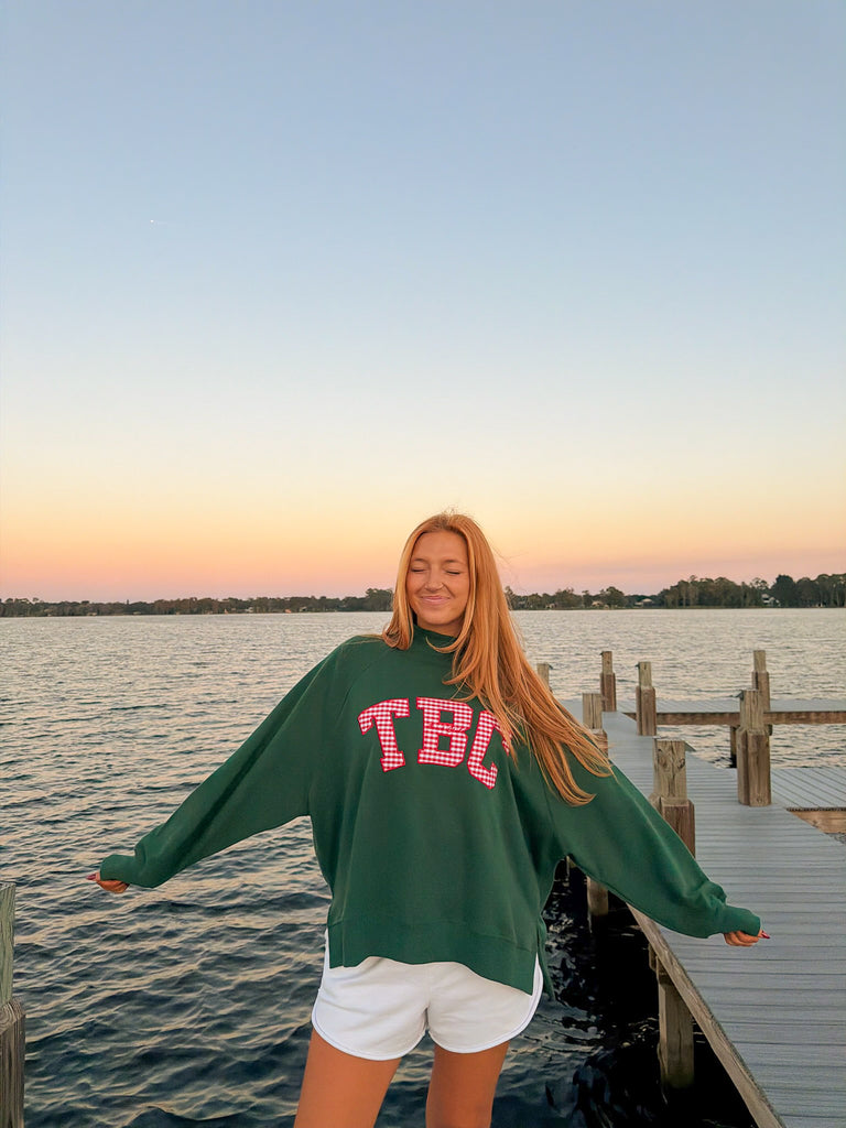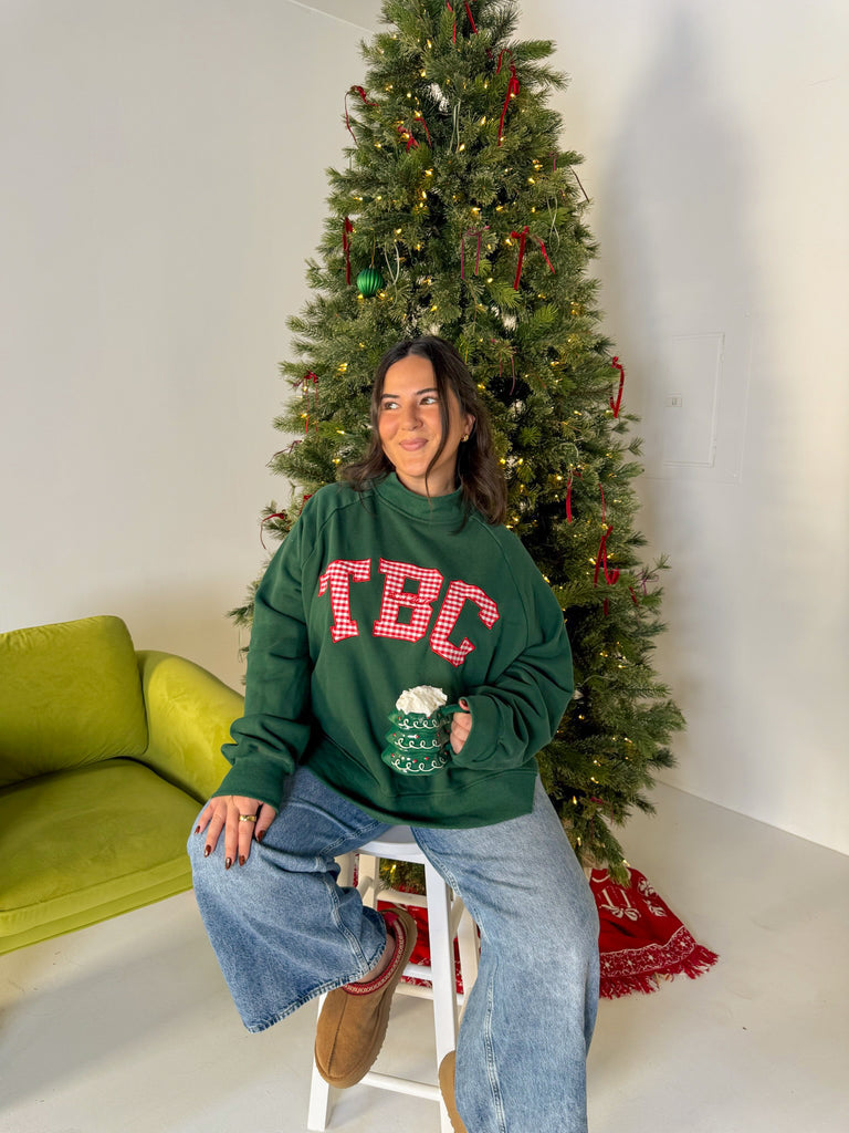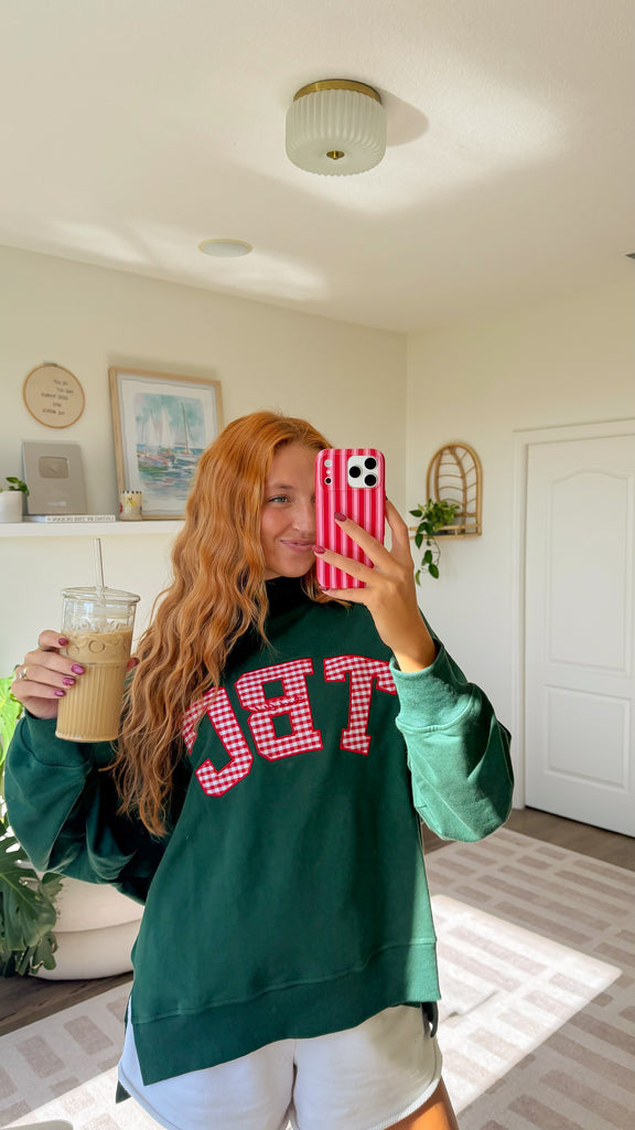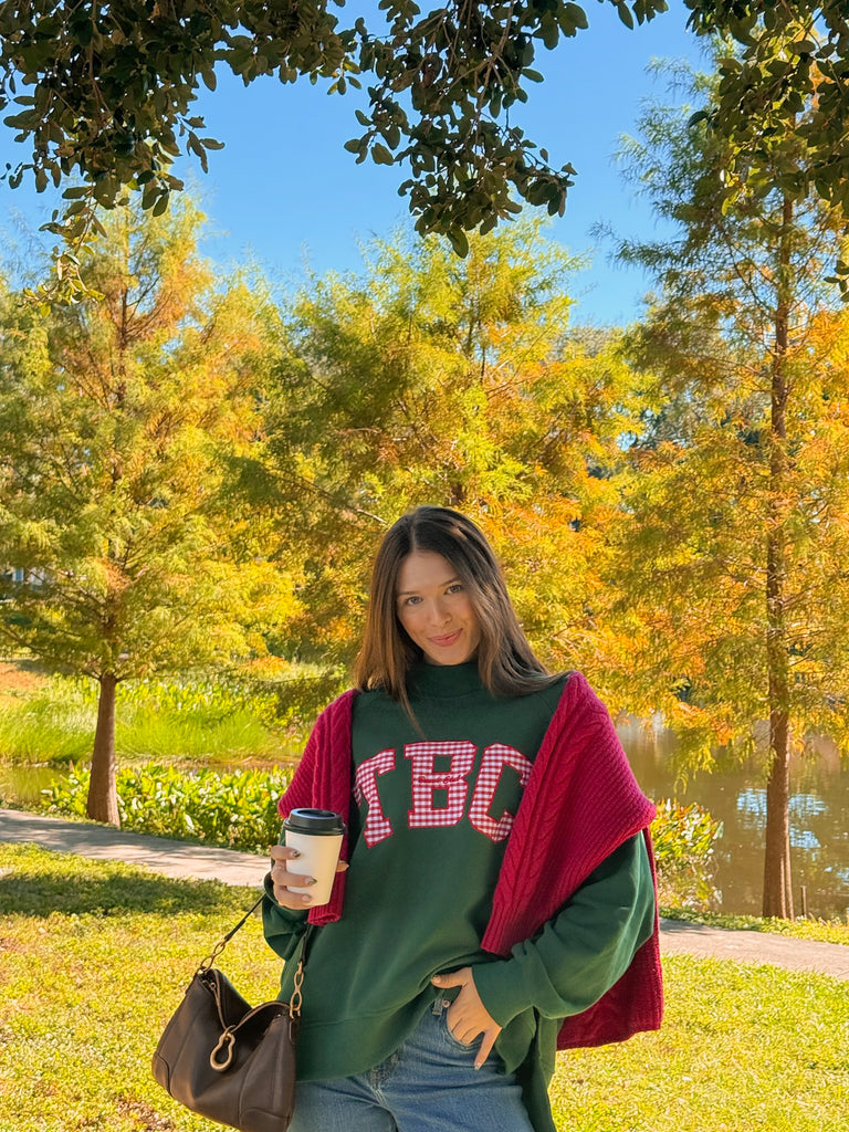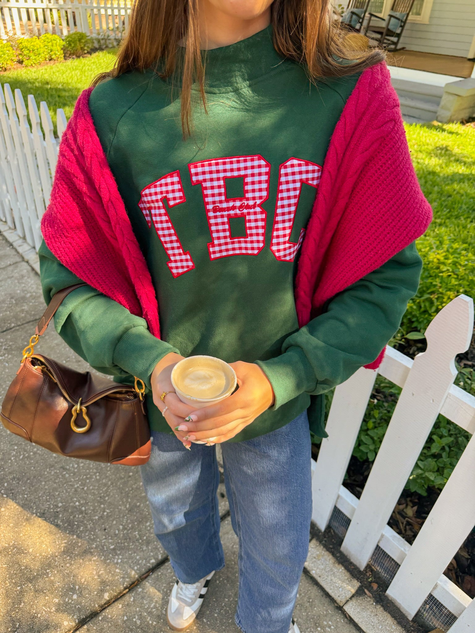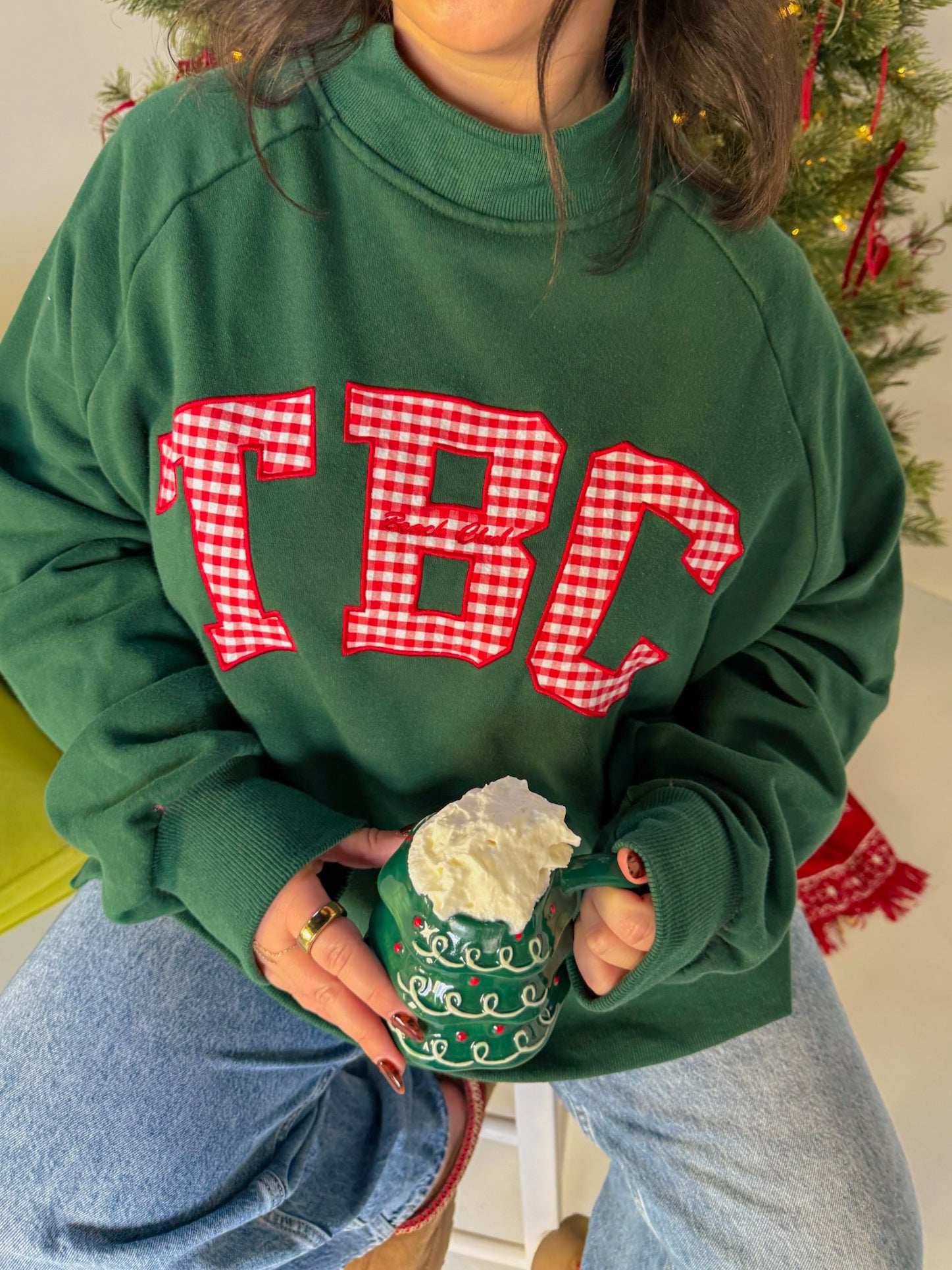 Our special edition, Christmas TBC Mockneck, comes in forest green with red gingham and varsity-inspired lettering. The oversized, slightly cropped fit makes it easy to throw on with anything, while the custom French terry keeps it soft, boxy, and wearable every day.