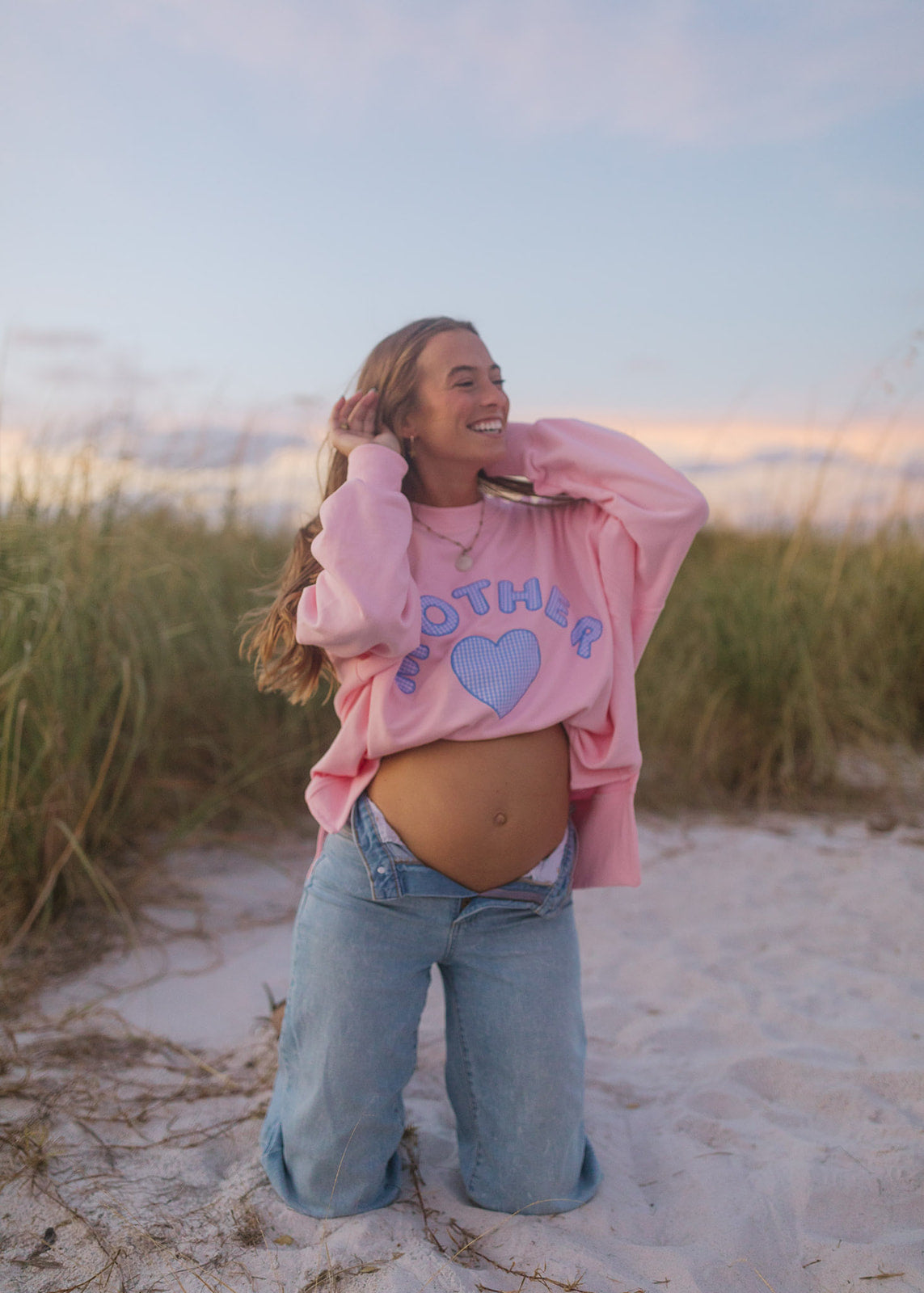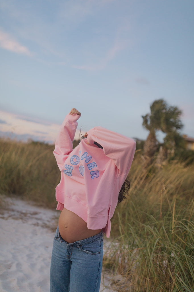 Soft, sweet, and made to wear on repeat. The Mother Crewneck is a custom cut-and-sew crewneck with an oversized, boxy fit that feels effortless but put-together. Designed in a pastel punk base with a baby blue gingham heart and curved “MOTHER” lettering, it is a subtle statement piece for the ones who do it all.