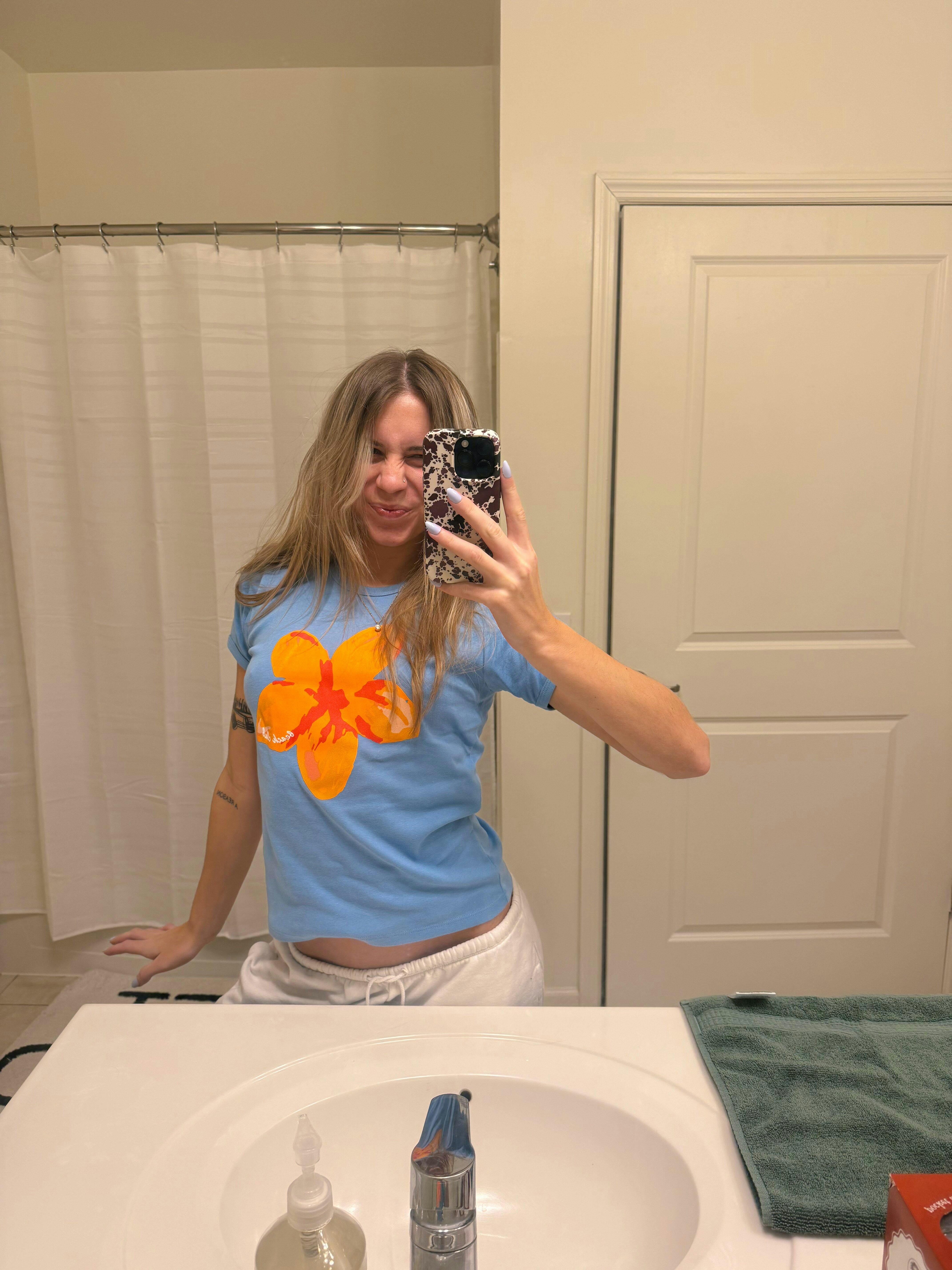 Bring tropical to your everyday look with the Bahama Blue Flower Tee. Featuring a vibrant flower print that pops against its cool ocean-blue backdrop, this 100% cotton ribbed baby tee offers the perfect amount of stretch and structure. With its crew neckline, short sleeves, and full-length silhouette, this tee is not a loose or oversized fit—it hugs in all the right places.